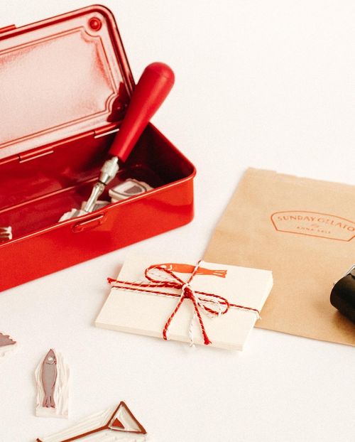 These paper products are all hand made in my brooklyn apartment. I start by hand carving each stamp from a vinyl block, then apply paint with a roller and stamp each product - meaning they are unique and specially made for you.